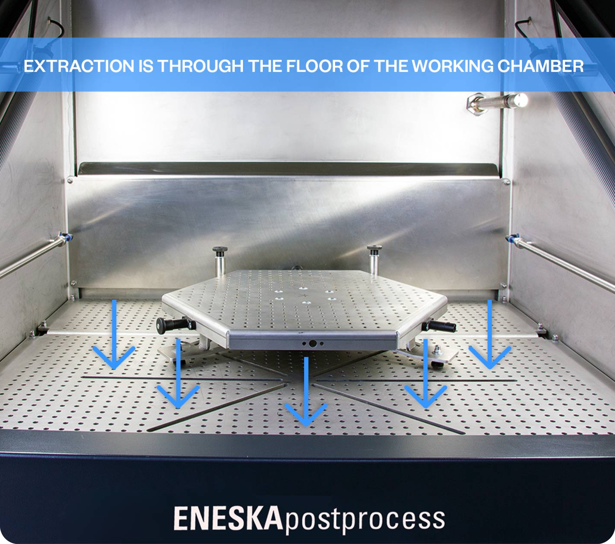 With safety as the top priority, the ENESKApostprocess can only be used with the extraction system running. Extraction is through the floor of the working chamber, with flow-optimized air guidance. In addition, the system cannot be opened until the automatic cleaning process has finished, ensuring residual dust has been extracted from all corners.