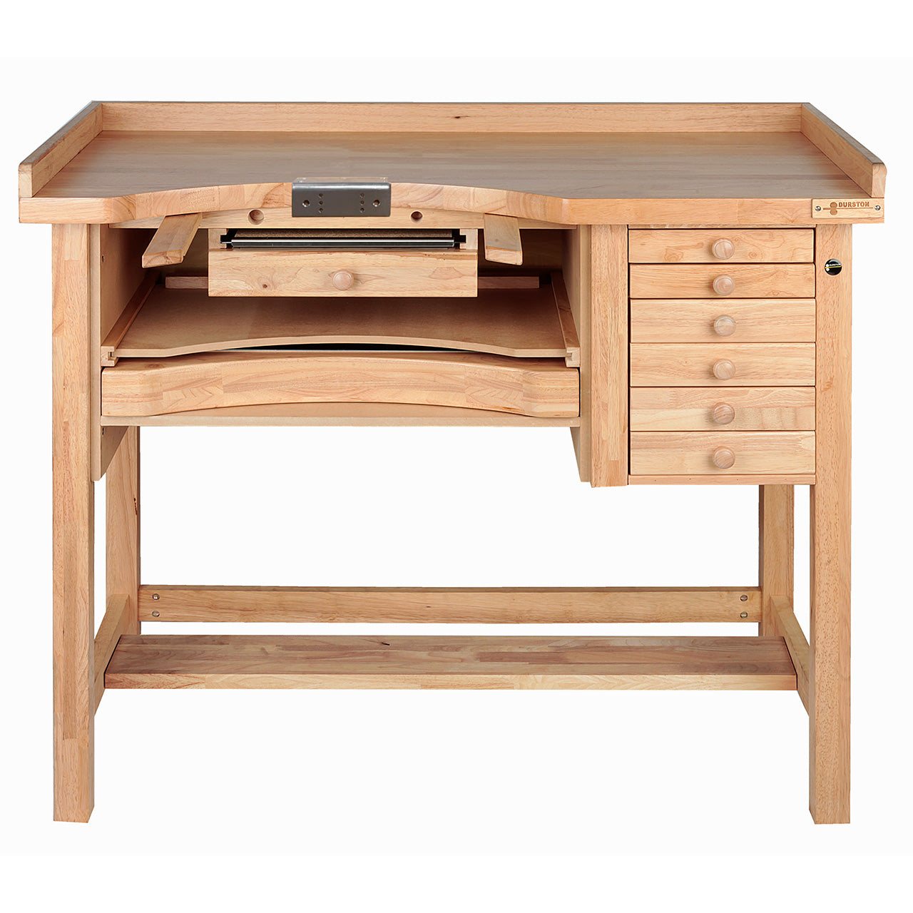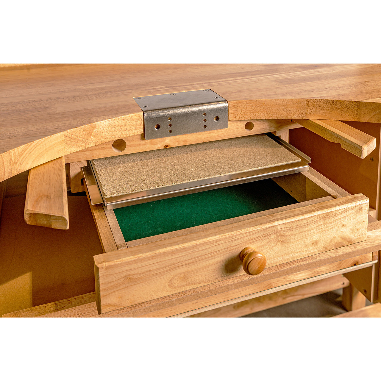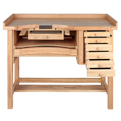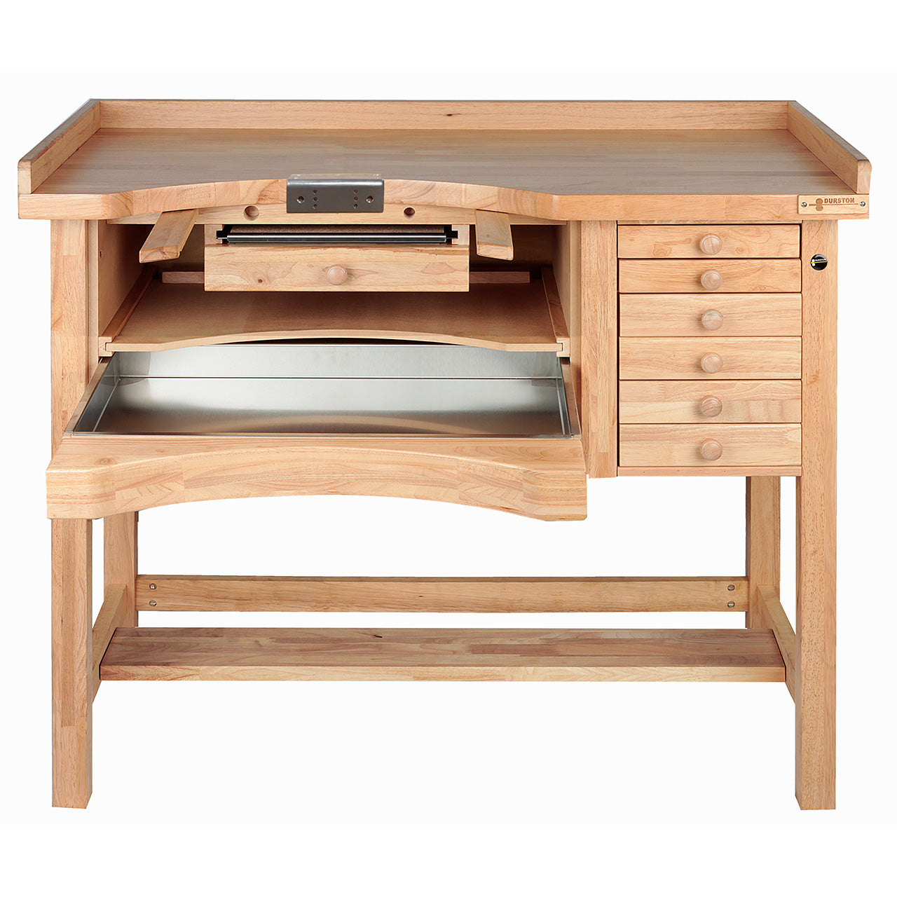 The Durston Superior Jewelers Bench is fully loaded with features, including an HPB pull out work area, catch drawer with stainless steel tray, pull out soldering board, bench peg mounting point, arm rests and six side drawers provide plenty of storage. Made from quality hardwood and easily assembled (simply attach legs). The retaining surround/lip surrounding the workbench top is 20mm (3/4") thick and extends 50mm (almost 2") above the work surface. WxDxH measurement is: 1240mm x 610mm x 1010mm (approx. 49"x24"x40"). The knee hole/opening measures 595mm (23-1/4") in height by 690mm (27-1/4") in width. Made in Vietnam. Ships from Arizona.