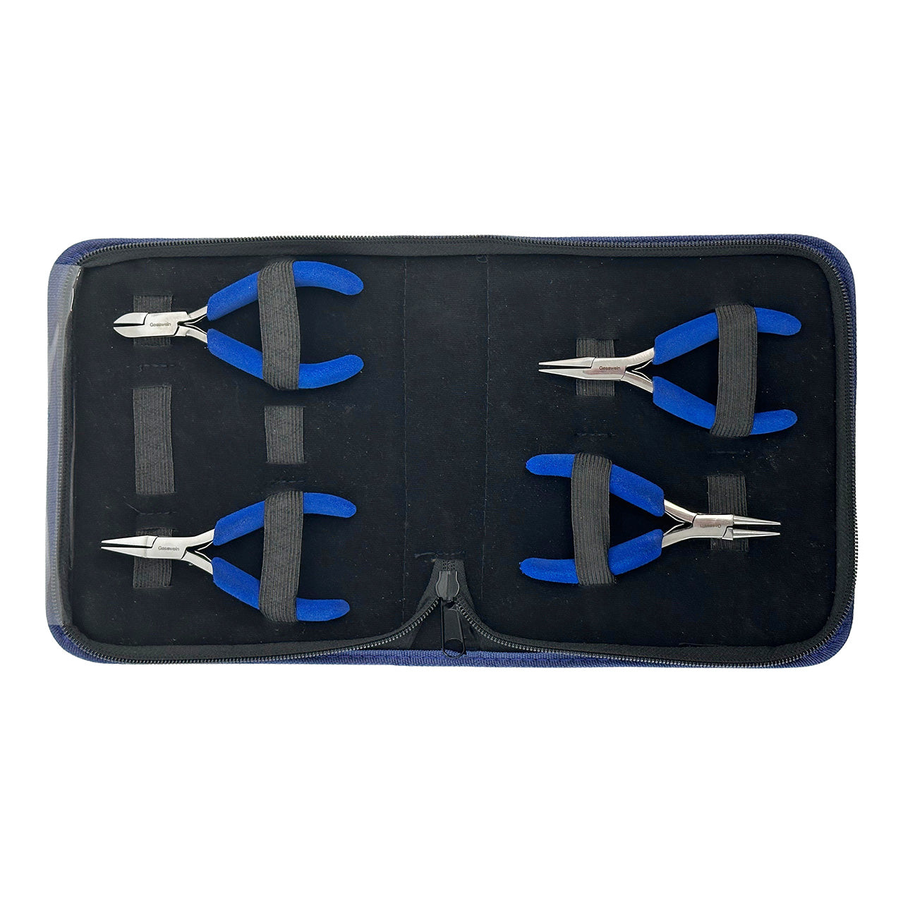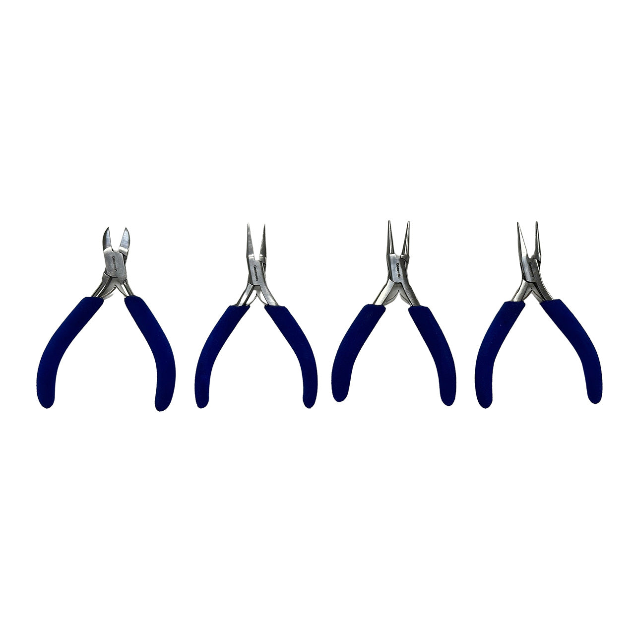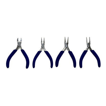 Our 4-piece Foam-Grip Stainless Steel set includes four of the most popular style of pliers. Styles include Flat-Nose, Round-Nose, Chain-Nose pliers, and Side Cutter. All Pliers/Cutter feature a box joint for stability, durable double leaf springs and easy-to-handle foam grips. Perfect economical set for the beginner jeweler to the well-seasoned bench jeweler. They measure 4-1/2" long overall and supplied in a convenient closeable display case. Made in Pakistan.Â