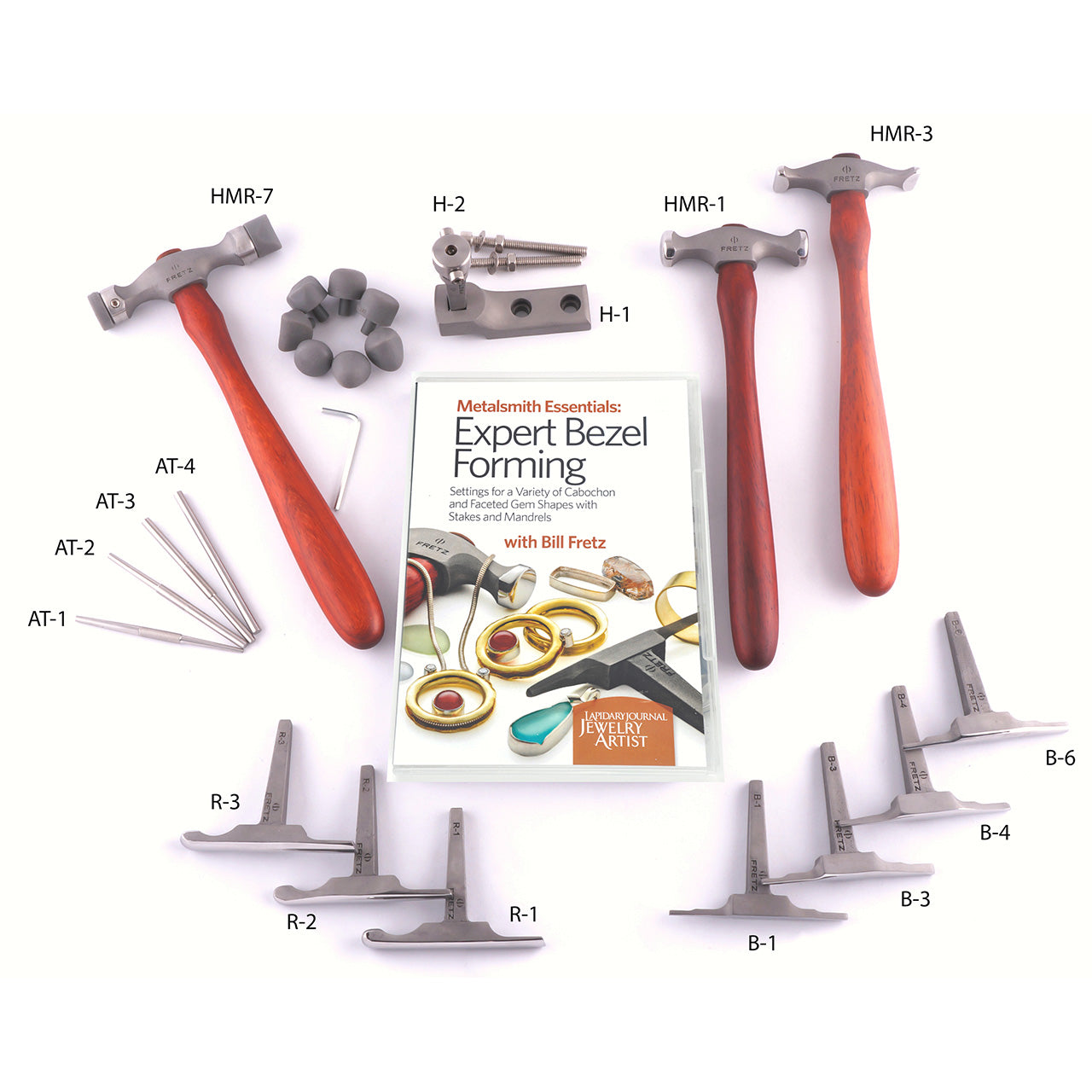 The Fretz JA-3 Expert Bezel Forming Video Tool Set includes the tools and the DVD you need to create settings for a variety of cabachon and faceted gem shapes.
