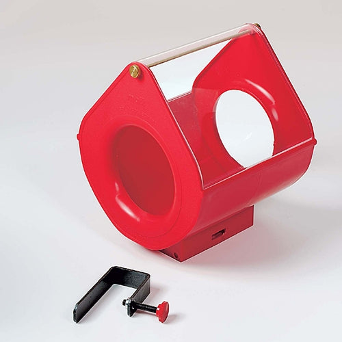 Features high-impact extruded plastic housing and easy-to-remove, non-glare Plexiglas shield. Attaches to bench with integral C-clamp when needed; stores easily when not in use.
