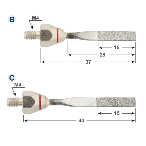 Mounted Diamond Files fit both Ultramax DF & SF handpieces using the 4mm tool adapter (supplied with Ultramax UF-9700 handpiece). For UM-1200, the 8/4mm tool adapter is required to use these files.